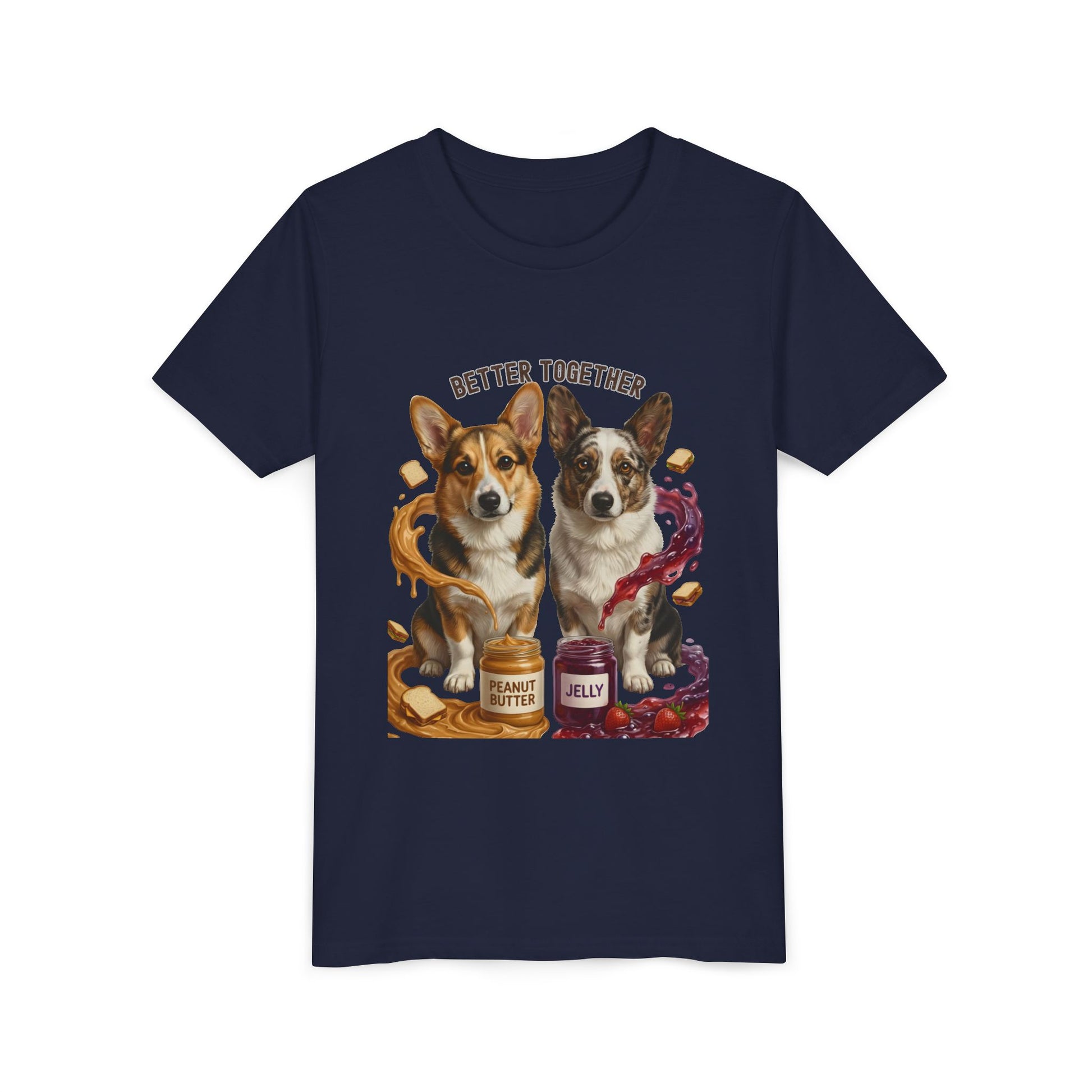 Let your kid show off their lover for adorable corgis and playful peanut butter & jelly fun with this Better Together Peanut Butter & Jelly corgi t-shirt. Designed to delight young dog lovers, this graphic tee features two cute corgi littermates, Peanut Butter & Jelly, surrounded by a fun peanut butter and jelly themed background that's full of friendship and flavor.